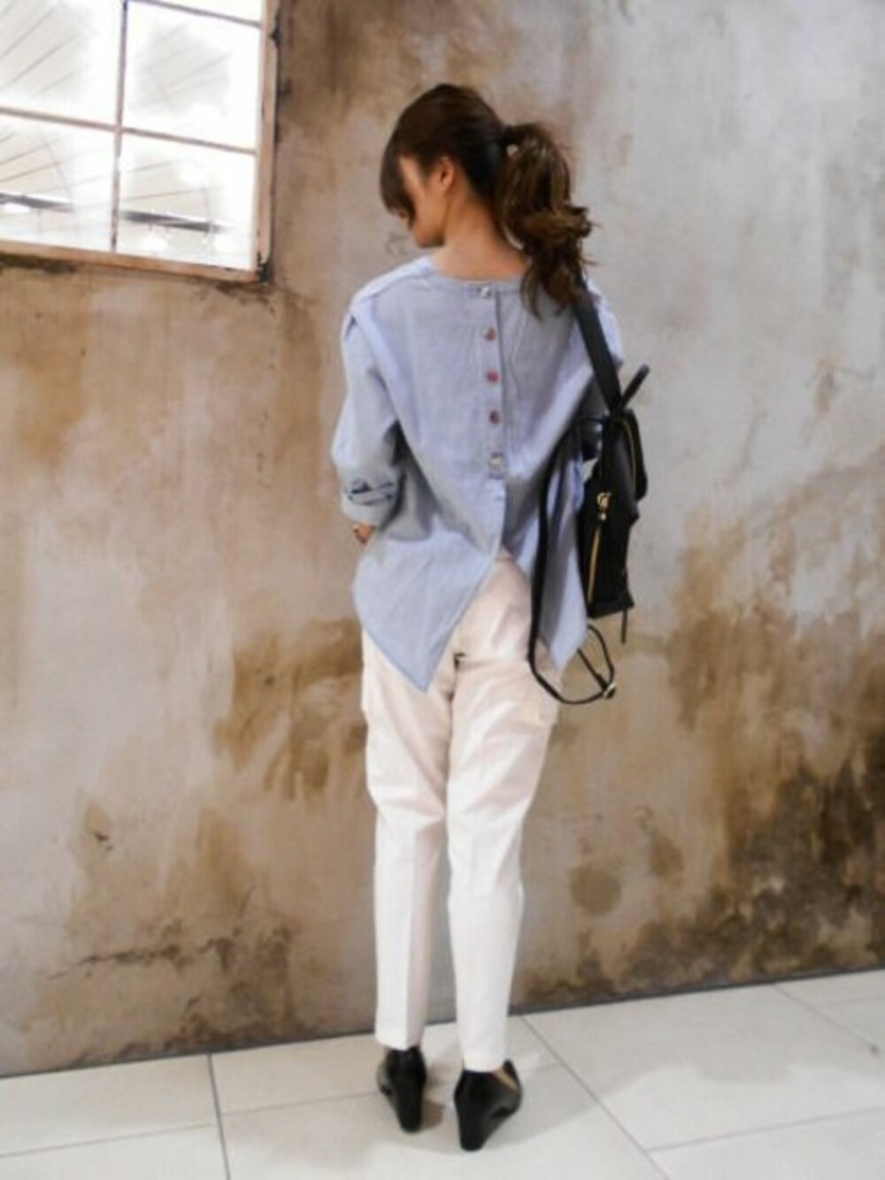 後ろ姿まで抜かりないデザイン性のあるパンツスタイル ボトムに合わせて着方を楽しめる2WAY仕様のデニムブラウスは ホワイトのカードパンツと合わせると爽やかなカジュアルスタイルに。