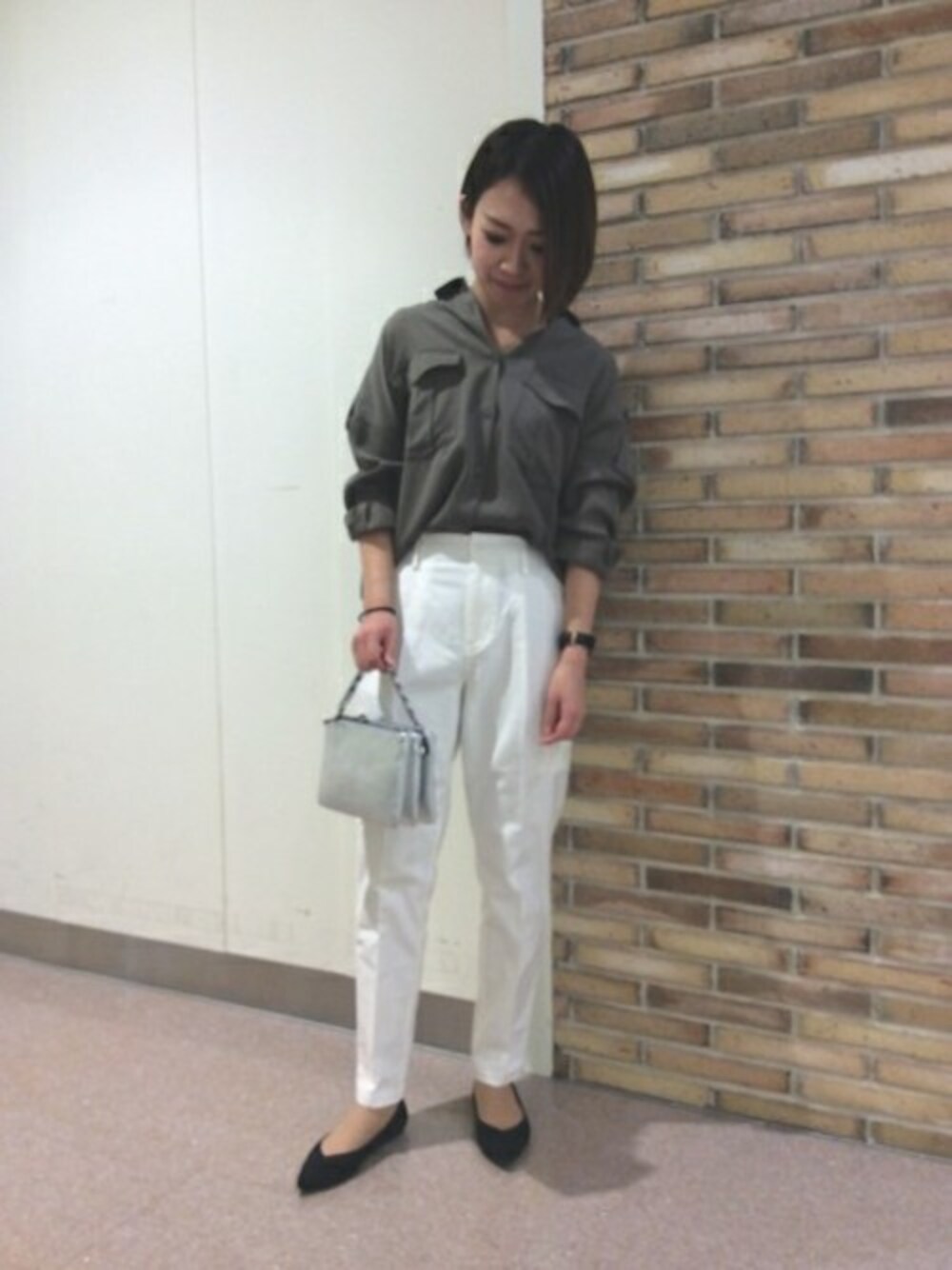 ハンサムなシャツスタイル テンセル生地で落ち感がありかつ程よい肉感で体のラインをカバーしてくれるミリタリーシャツ。 ハードになりすぎないようにきれいめで上品な白パンツとあわせてハンサムにまとめました。