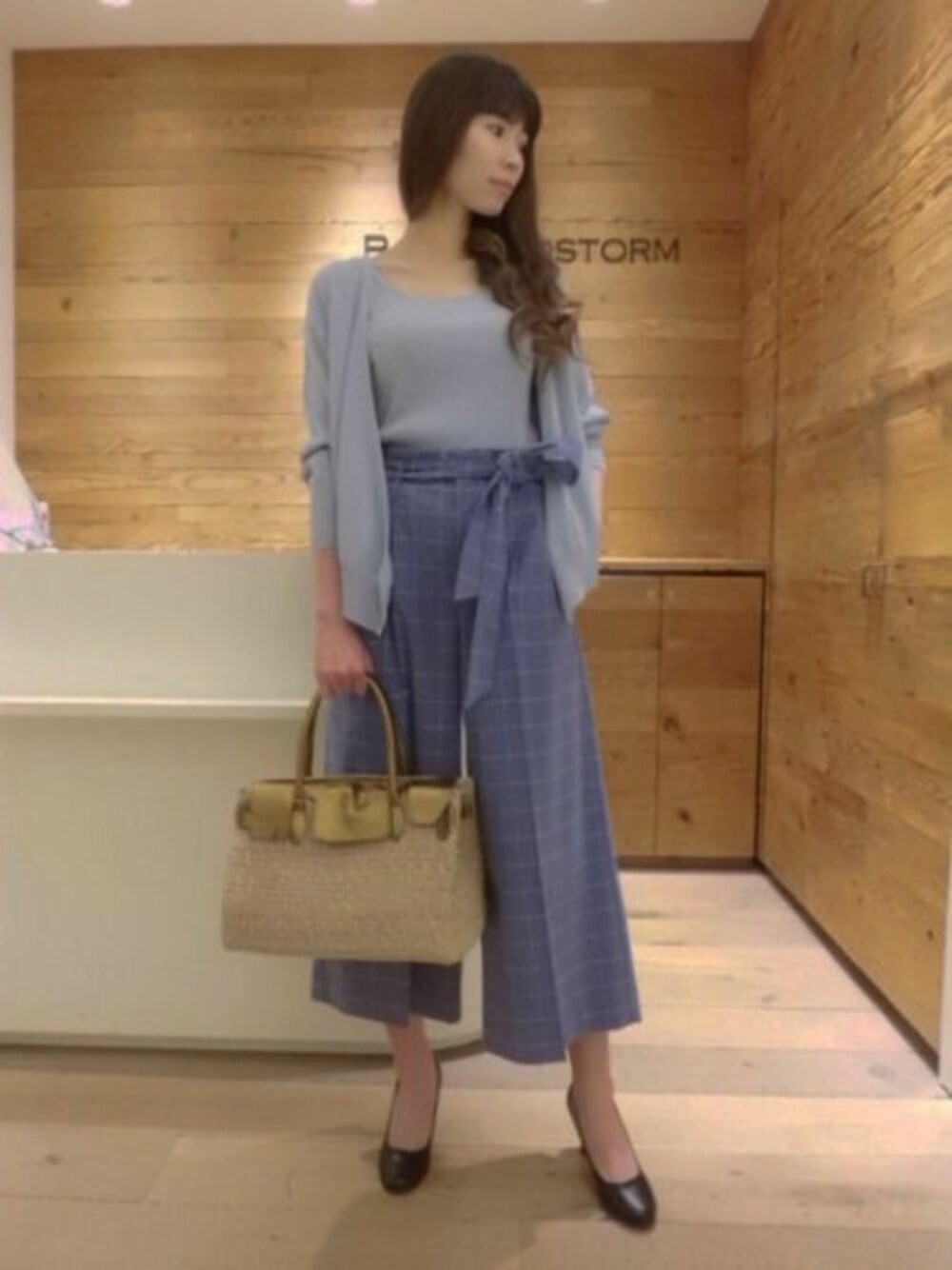 ワントーンコーデ 着こなし方次第で自由にアレンジが楽しめるカシュクールニット。 今日はサイドのボタンをはずしてカーディガンとして着ました。 カゴトートを合わせて春の装いに。