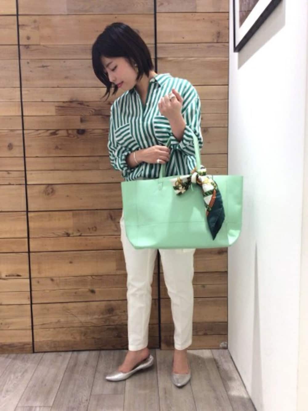 ハンサムなシャツスタイル 上質で洗練されたシルク混のストライプシャツはコーディネートを一気に華やかにしてくれます・ 袖をまくり、襟元を抜いたスタイリングでこなれ感がアップ。