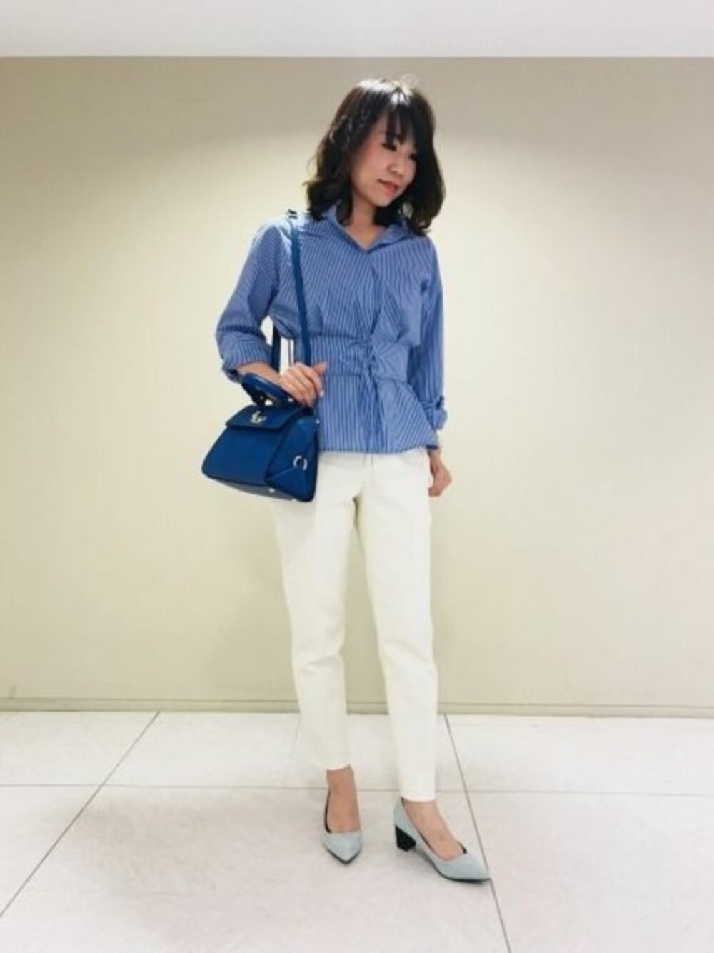 爽やかなシャツスタイル ウエストマークによりメリハリが出てスキニーデニム合わせたスタイリングは バランスよくスタイル良く見せてくれます。 ブルーでまとめてさわやかに。