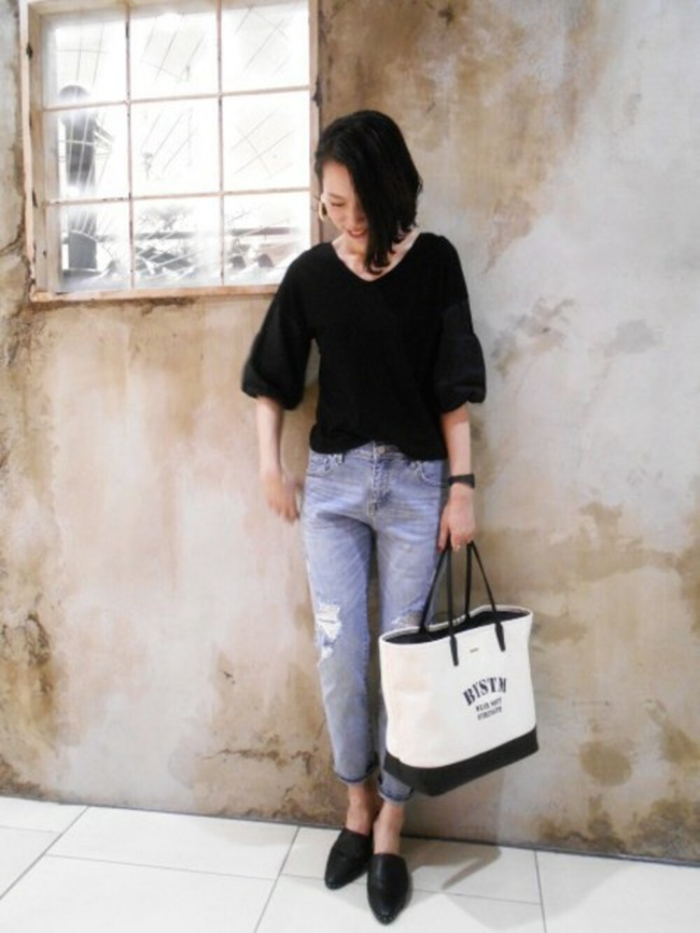 モノトーンでまとめたデニムスタイル デニムは定番カジュアルスタイルなので黒でまとめてシックな印象に。
