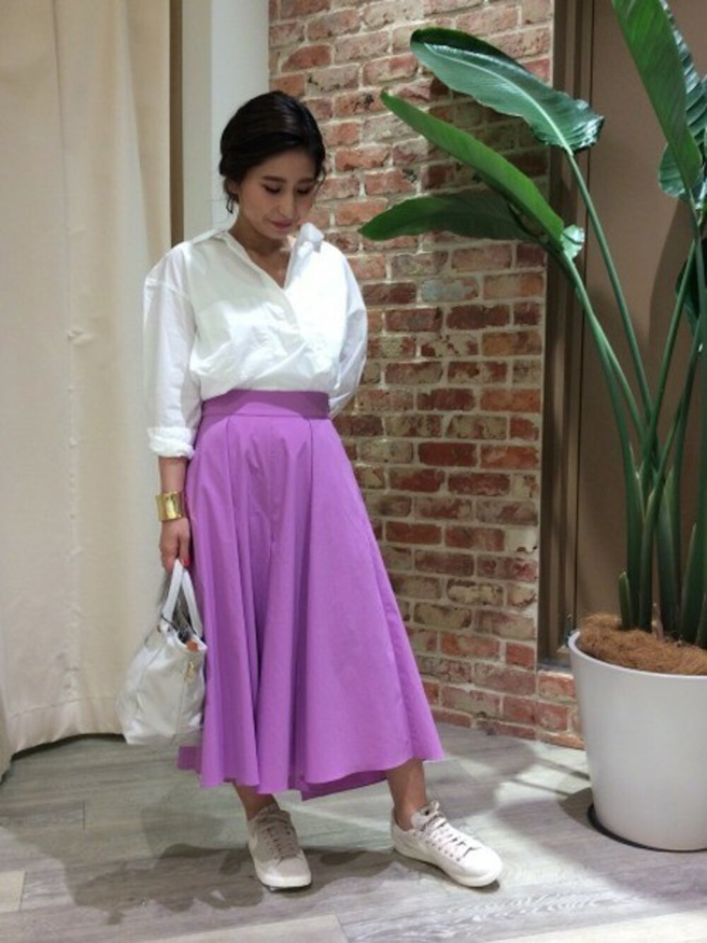 きれいめカジュアルにまとめたさわやかなスニーカースタイル さわやかシャツと春カラーのスカート見えするきれいめパンツと合わせて爽やかな印象に。 ウエストINすることで女性らしくすっきりした印象に。 きれいめスタイリングにキャンバストートとスニーカーでカジュアルダウンさせてハンサムにまとめました。