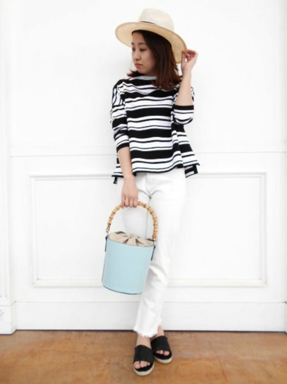 モノトーンでまとめた上品でさわやかな春スタイル ボーダートップスはカジュアルスタイルになりがちなので白デニムとあわせて さわやかな印象になるようまとめました。 モノトーンカラーでまとめたコーデにはバッグでアクセントを。