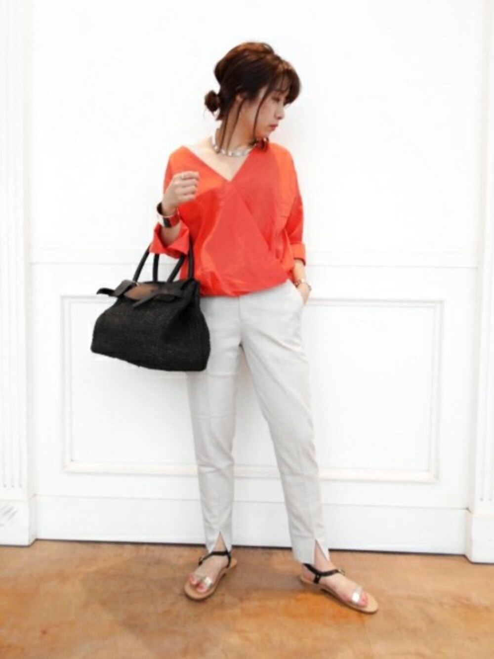 オレンジカラーが印象的なハンサムスタイル 鮮やかなオレンジトップスでコーディネートが華やかに。 ネックラインの大胆な開きとカシュクールデザインが女性らしい雰囲気を演出してくれます。
