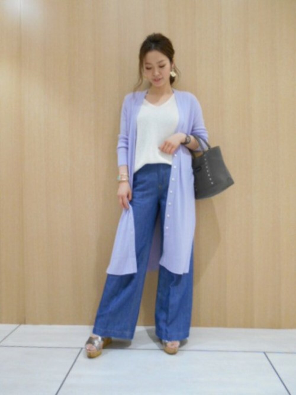 シンプルなパンツスタイル ラベンダーのロングカーディガンを羽織るだけで いつものデニムスタイルが華やかに仕上がります。