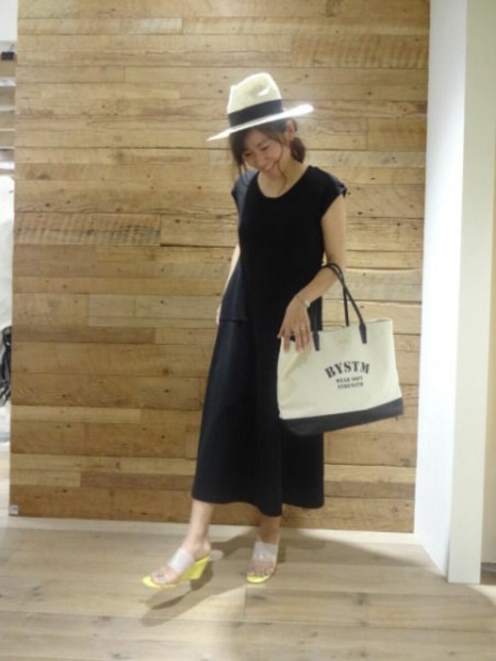 女性らしい夏のワンピーススタイル 少しスポーティーな印象のあるフライスジャージー素材を使用した、女性らしいシルエットのフレアワンピース。 モノトーンコーデにイエローのサンダルが映えて一気にリゾートな雰囲気に。