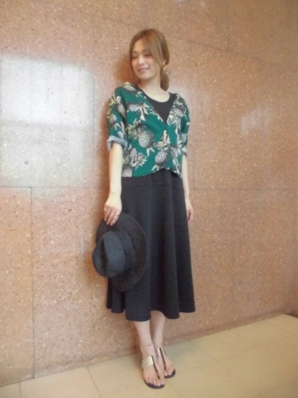 女性らしいシルエットのカジュアルなワンピスタイル ワンピは袖もフレンチスリーブで、ブラウスなど合わせても綺麗に着用いただけます。 今年おすすめのパイナップルシャツと合わせると、一気にこなれ感ある印象に。