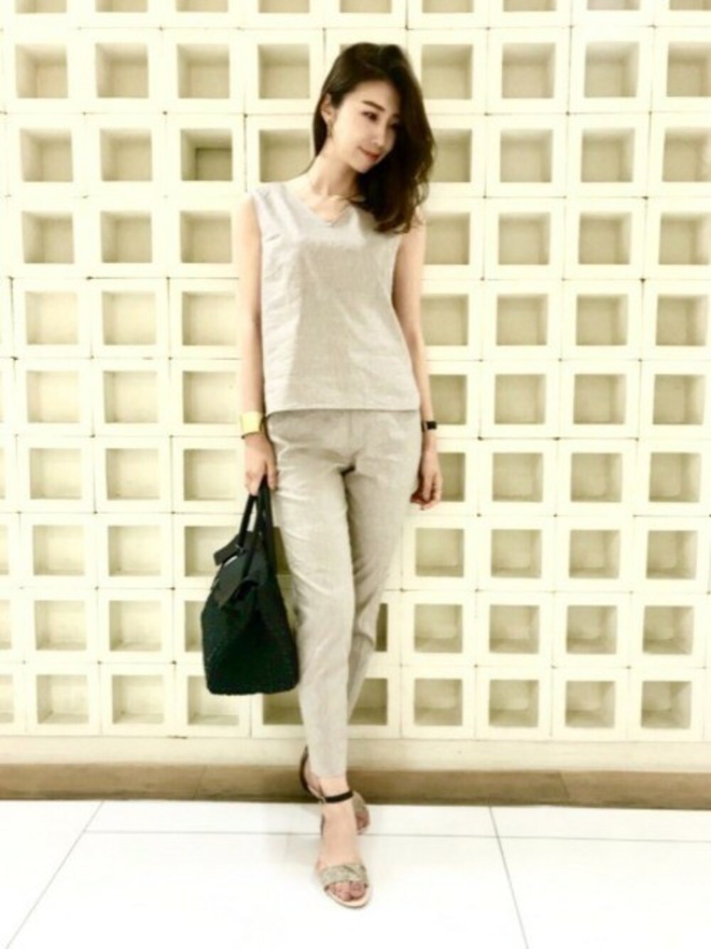 清涼感あるリネン素材を使用した大人な雰囲気のセットアップスタイル モノトーンでまとめることで上品でハンサムなスタイリングに仕上がります。