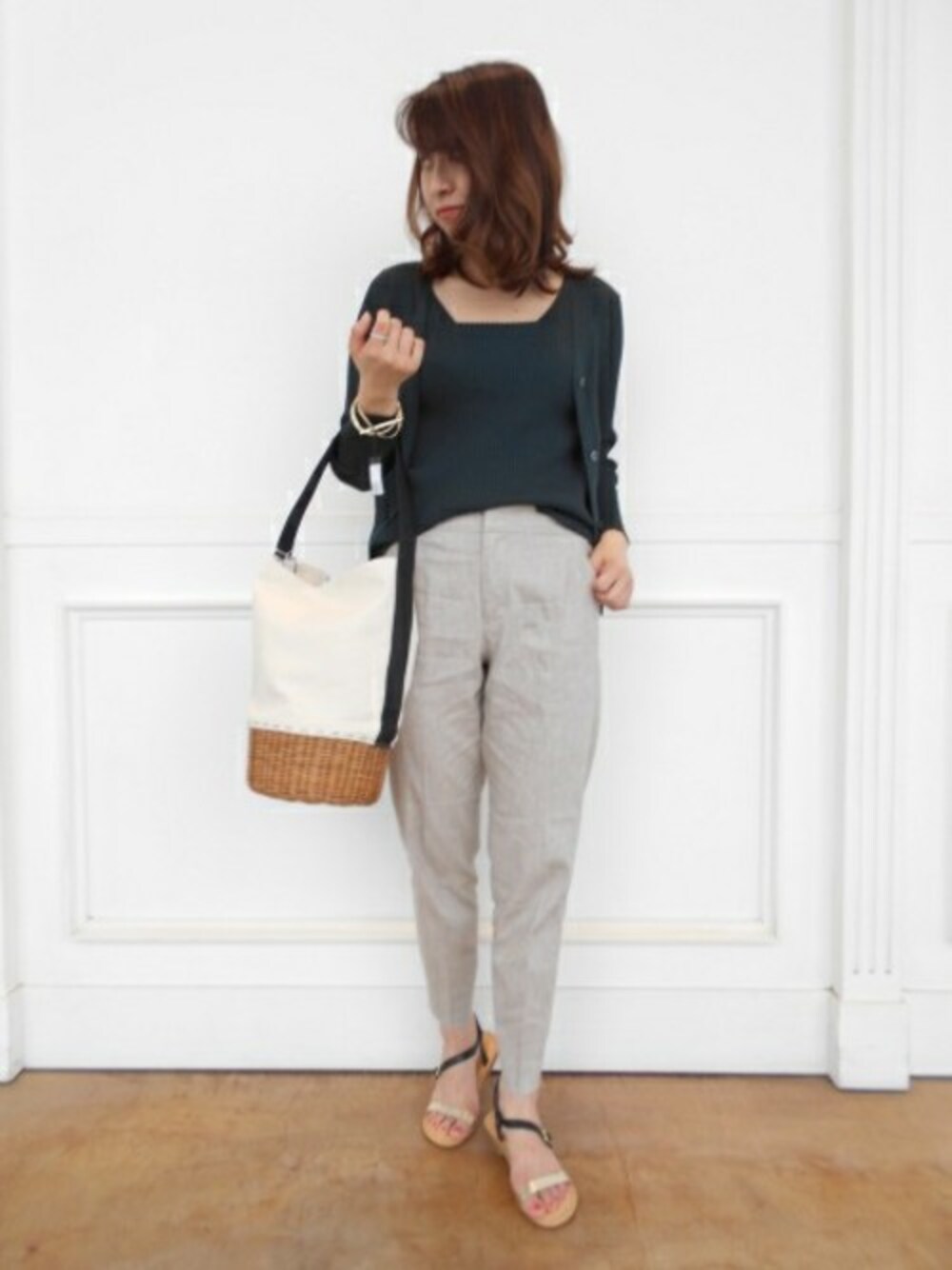 アンサンブルでも単品でも着まわしのきくリブアンサンブルにナチュラルな風合いのリネンパンツを あわせてさわやかにまとめました。 カーディガンはボタンを全部留めてさらっとプルオーバーのように着こなしたり、ボタンを全部開けてアンサンブルとしての着こなしも可能。 ノースリーブタンクとカーディガンそれぞれ単品で着こなすのでコーディネートの幅が広がります。