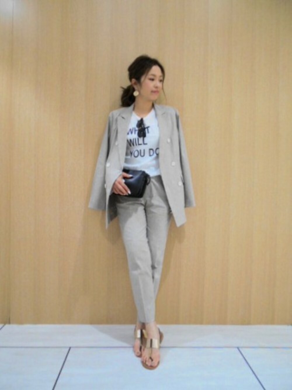 ジャケット × Tシャツでハンサムなカジュアルスタイル きれいなシルエットのテーパードパンツにTシャツを合わせた カジュアルダウンさせたジャケットスタイルはこなれ感があっておすすめです。