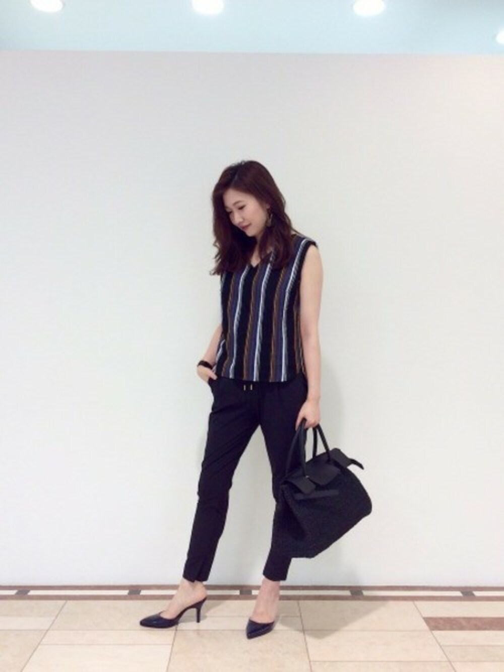 パンツは内側の裾にさりげなく入ったスリットがポイントです。 ナイロン素材でスポーティーに仕上がる、トレンドの詰まった一枚です。 1枚でサマになるストライプブラウスはシンプルなボトム合わせのスタイルにトレンド感をプラスしてくれます。
