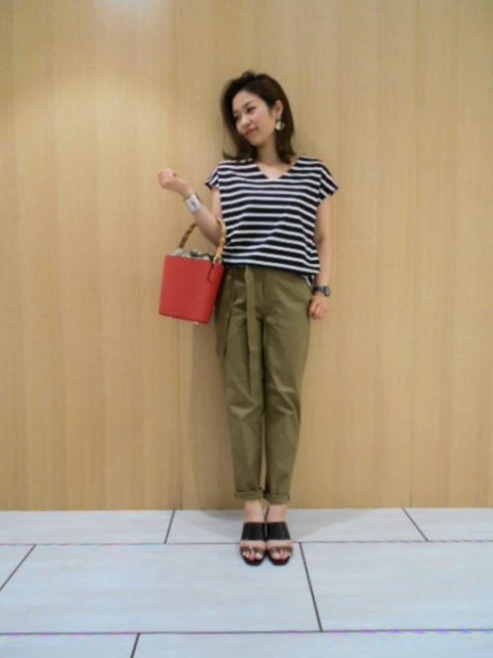 ストレッチが効いた快適な穿き心地を兼ね備えた定番チノパンはボーダートップスとあわせて カジュアルにまとめると◎ 落ち着いたカラーのコーディネートなのでバッグで明るい色をプラス。