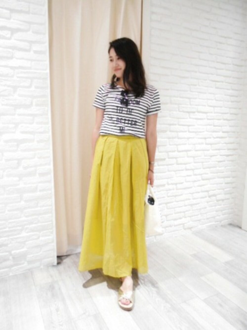 ボーダーTシャツ×カラーロングスカートで一気に夏スタイルに。 いつものTシャツをボーダーに変えるだけでマリンテイストな爽やかコーデにまとまります。 カラースカートと合わせてリゾートスタイルに仕上がります。
