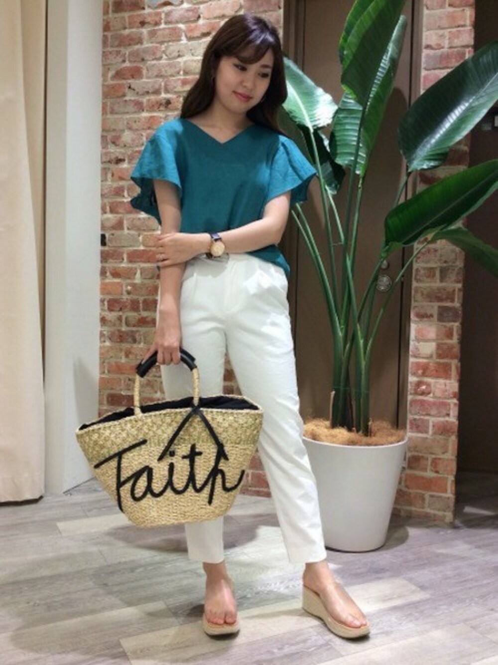 華やかなグリーンカラートップスには爽やかに白ボトムスを合わせたさわやかなカジュアルスタイルがおすすめです。 夏らしいさわやかな印象に。