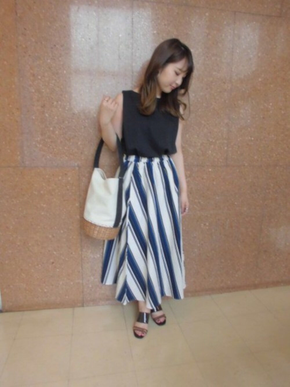 ハリ感のあるスカートは、ナチュラルでキレイ目になりすぎないので普段使いに丁度いいです。 ビッグボーダー柄で一枚あるとおしゃれにキマります。
