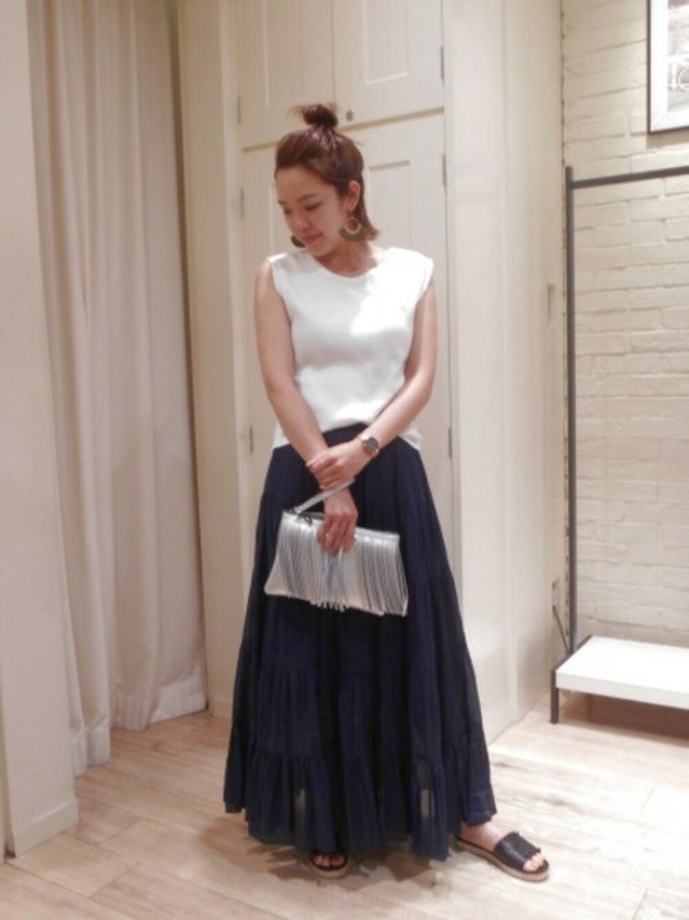 ティアードデザインのボリュームあるシルエットのロングスカートなので シンプルにまとめるだけでこなれ感ある華やかな印象に。 リゾートスタイルにおすすめです。