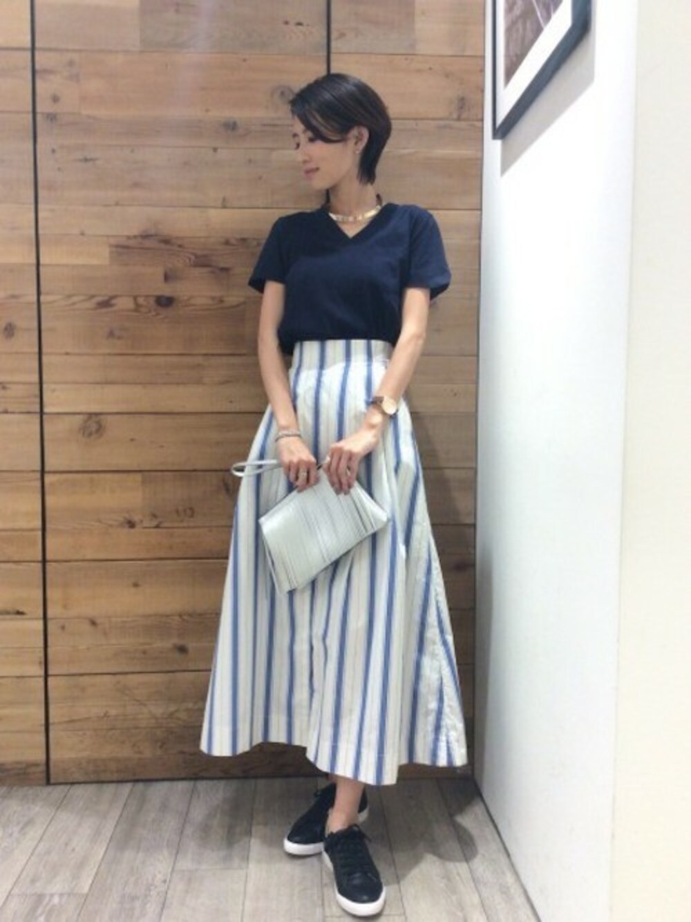 鮮やかなストライプスカート×シンプルTシャツで即オシャレ見えスタイル ベーシックなTシャツも、色や柄で彩りをプラスすればオシャレ見え確実です。