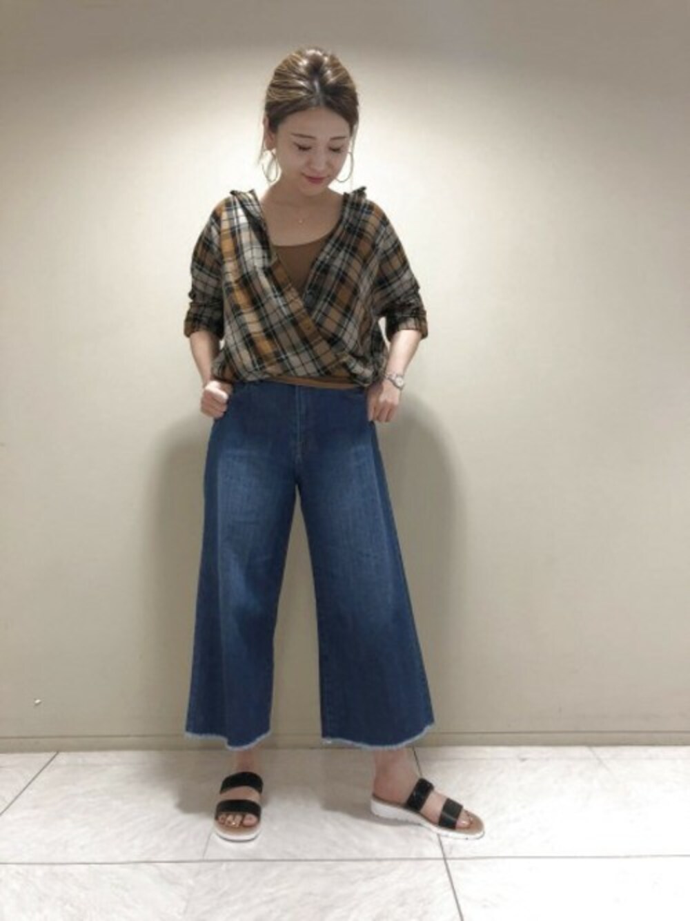 落ち着いたカラーのチェックシャツを取り入れるだけで一気に秋の装いに。 第4ボタンと一番下のボタンを脇で留めたカシュクールシャツとしての着こなしはこなれ感がでます。 チェックシャツはサラッとした着心地で、羽織ったり袖を巻くって抜け感ある着こなしなど秋先取りで楽しめます。