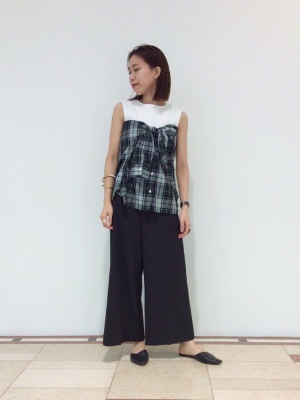 チェックシャツをビスチェ風に着ることで新鮮なスタイリングを楽しめます。 デニムと合わせてカジュアルに着るのもオススメです。