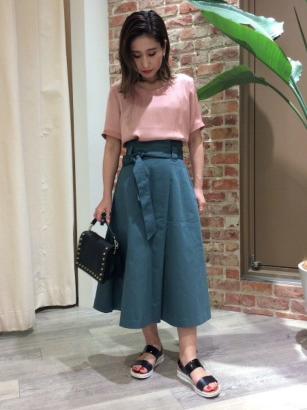 ブルーがかった清涼感のあるグリーンは、色×色でもばっちりキマる実は合わせやすい色合いになります。 甘いピンクのトップス合わせもハンサムでクールな印象に。 スタッズのバッグでエッジを効かせたスタイリングです。