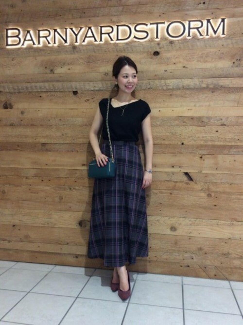 チェック柄がキレイなロングフレアスカート。 トップスはシンプルにまとめるとスッキリとした印象に。