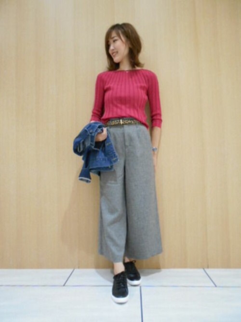 程よく身体にフィットするのでシンプルなリブニットはボリュームあるワイドパンツと相性◎ カラーニットで華やかな印象に仕上がります。