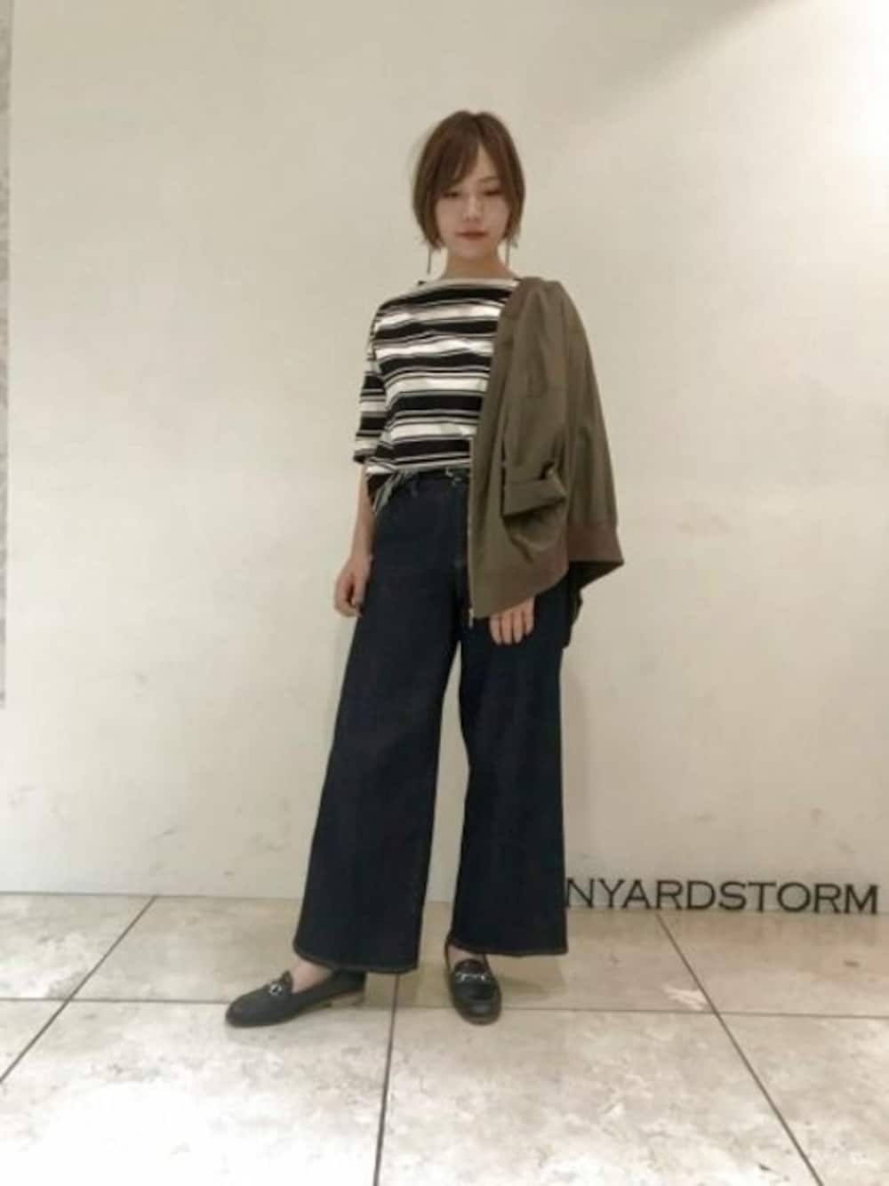 ボーダーのトップスはシンプルなボトルネック。袖の金ボタンがアクセントになります。 形が綺麗なワイドデニムにジップブルゾンで、ハンサムな装いに。