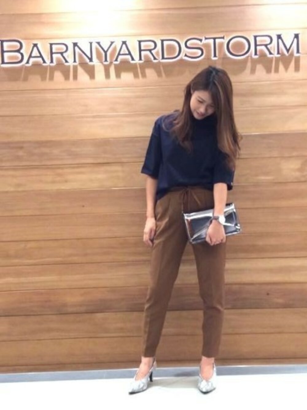 秋を意識した色合いでまとめたパンツスタイル シンプルながら1枚でサマになるシンプルトップスに 裾がリブになったスポーツライクなテーパードパンツでハンサムに。 足元もヒールにすることでカジュアルさも兼ね備えたレディなスタイルです。
