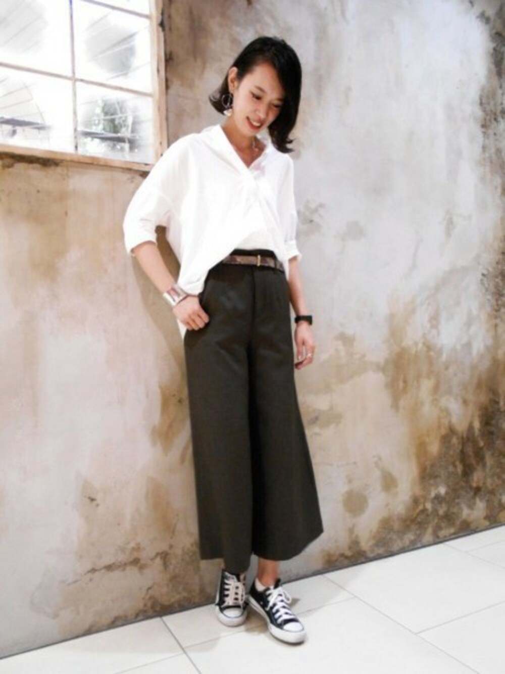 白シャツに秋素材のワイドパンツを合わせてこなれ感ある洗練されたスタイルに。 レオパードの細ベルトがアクセントに。 あえてスニーカーを合わせてカジュアルダウンさせました。