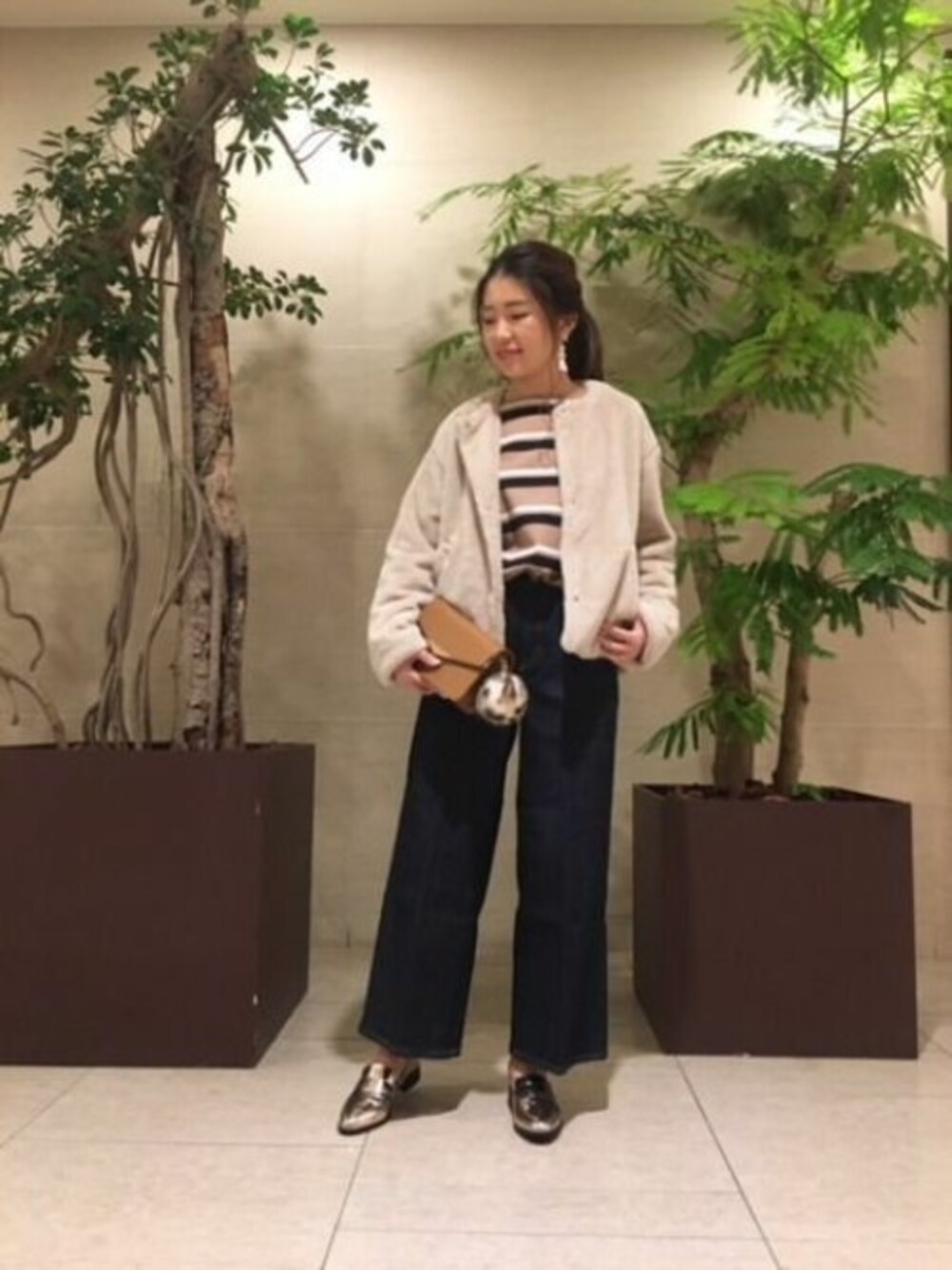 ボーダートップスにワイドデニムを合わせた定番カジュアルスタイルに さらっとエコファーブルゾンを羽織るだけでこなれ感ある雰囲気に。 小物はかっちりとしたきれいめ合うテムを合わせるとGOOD。