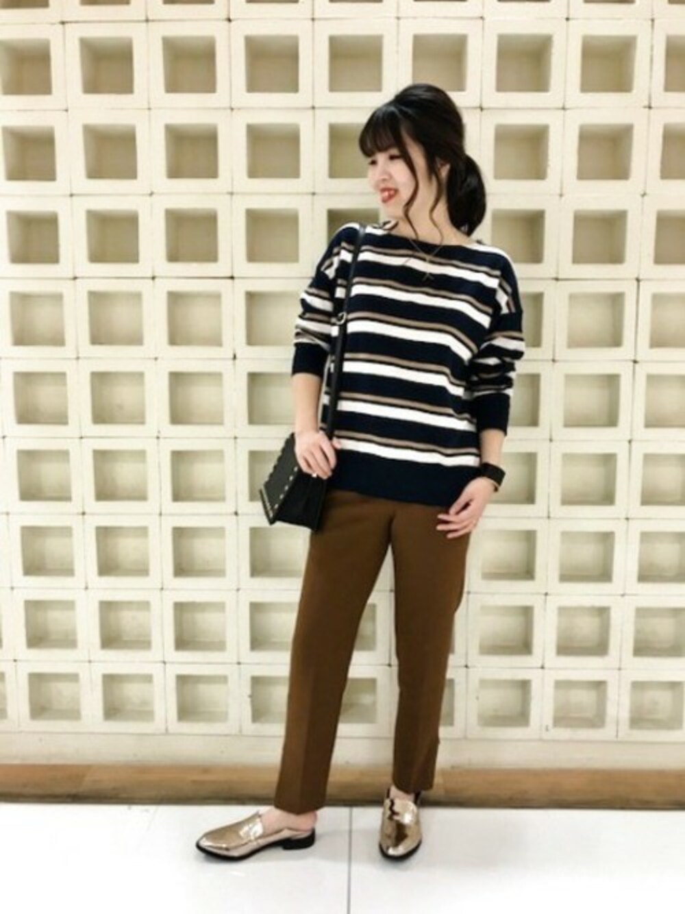ボーダートップス×秋カラーのきれいめパンツをあわせて大人が着こなすカジュアルスタイルに。 きれいめ小物を取り入れることでハンサムに仕上がります。
