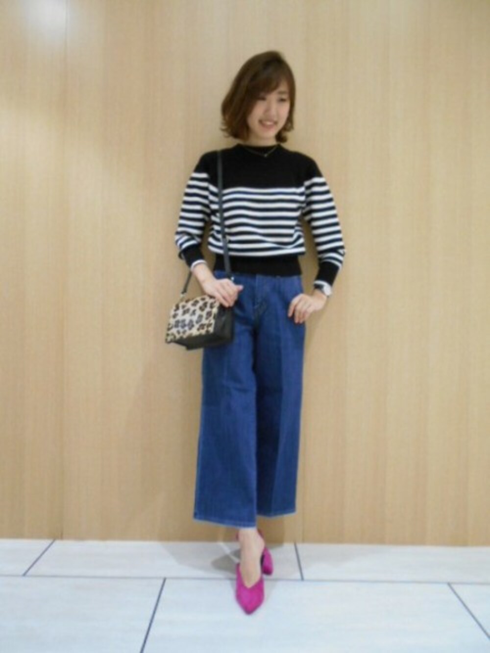 カジュアル過ぎないデイリーに使えるシンプルなボーダーニットにデニムワイドを合わせて 大人が着こなすカジュアルスタイルに。 カラーパンプスがポイントに