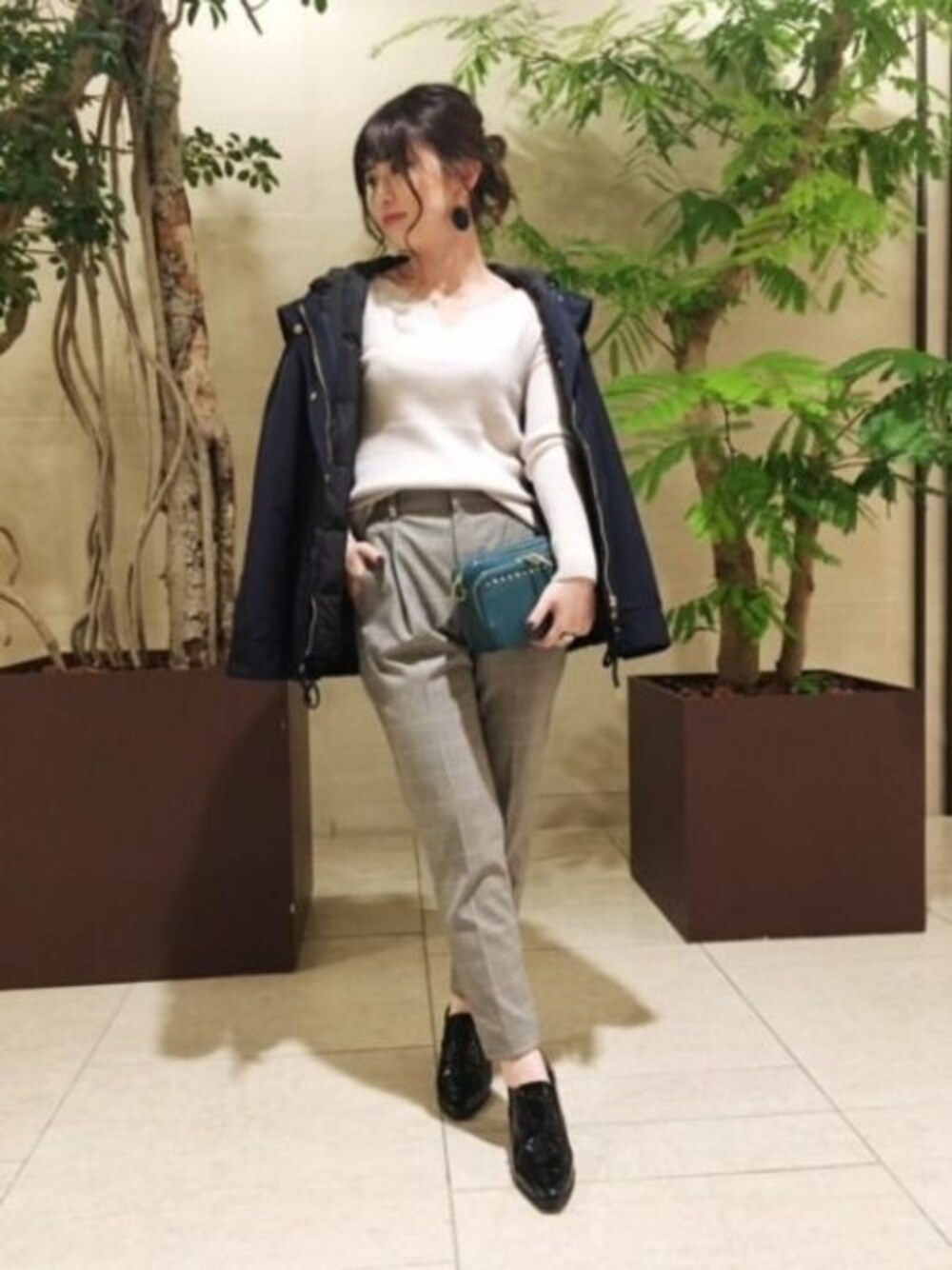 デコルテを綺麗に引き立たせてくれるシンプルなニットに チェック柄パンツを合わせてきれいめなハンサムスタイルにまとめました。 ロングシーズン使えるライナー付きフーディージャケットをさらっと羽織ってこなれ感を。
