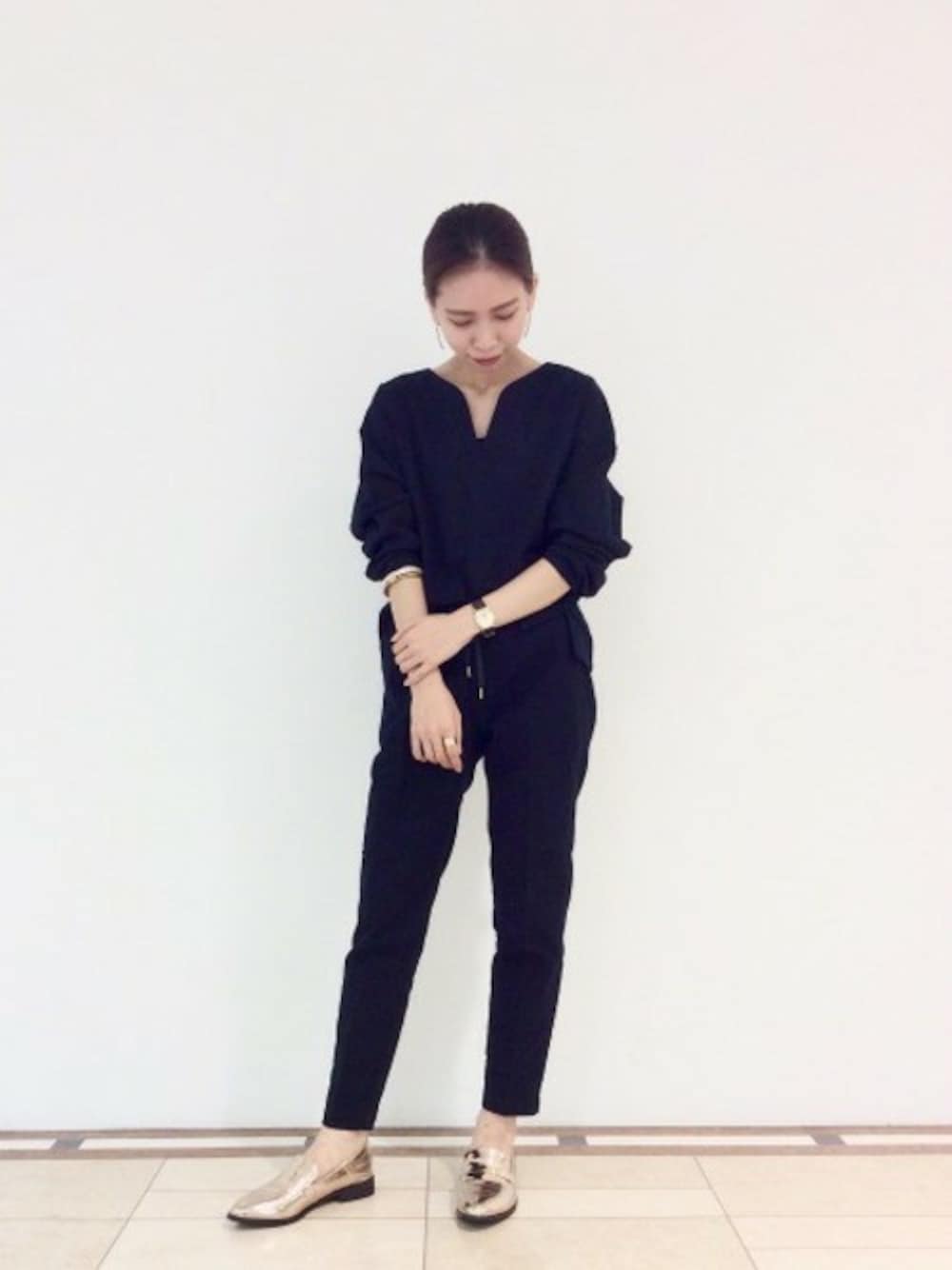 デコルテラインを綺麗に魅せてくれるブラウス。 同色のテーパードパンツと合わせてセットアップ風スタイルにまとめました。