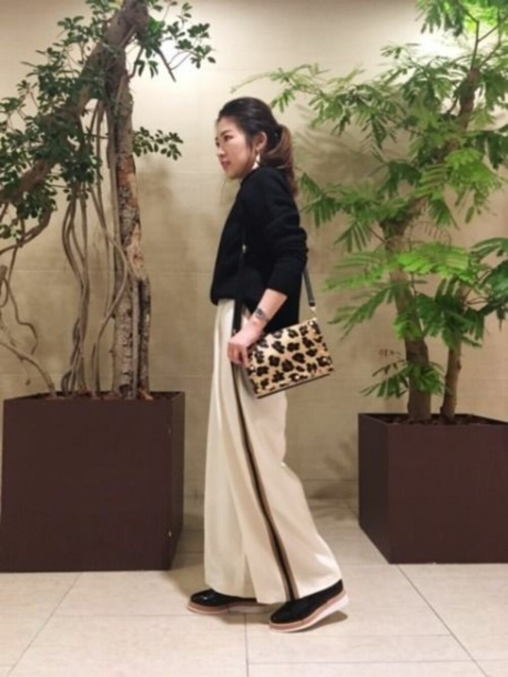 カラー配色のサイドのラインがポイントのハンサムにキマるワイドパンツ。 取り入れるだけで一気に大人顔に。 モノトーンスタイルにレオパード柄のバッグがアクセントになってます。