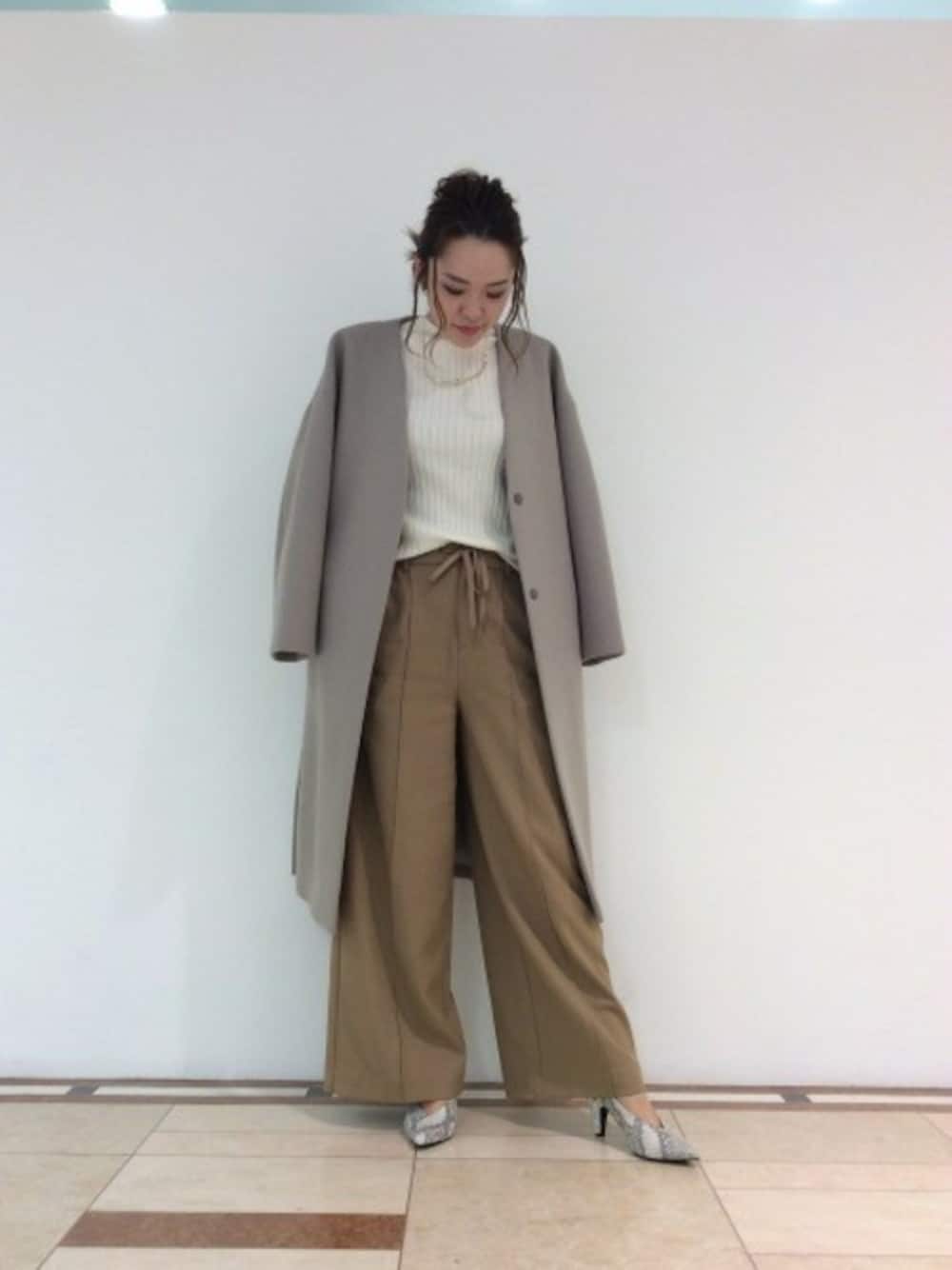 ベージュ系×白で大人のカジュアルスタイル。 パイソンのパンプスでハンサムに。