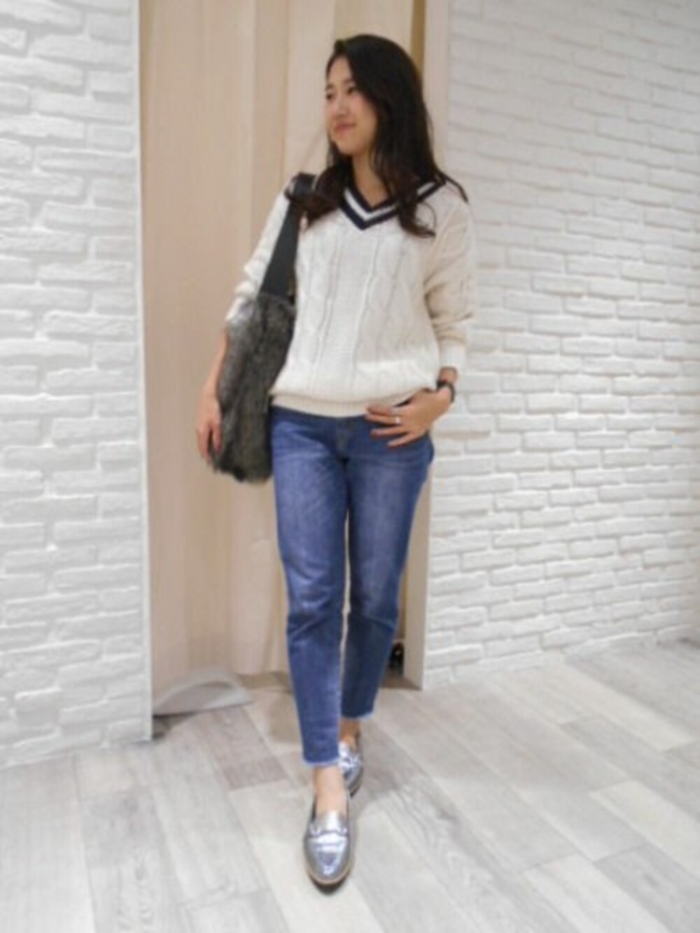 ニットとデニムの大人のシンプルカジュアルコーデ。 ファーバッグで暖かみをプラス。