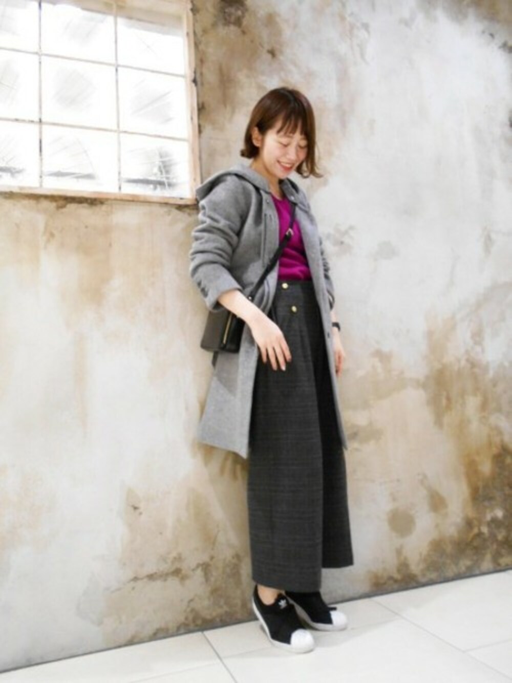 フードの取り外しも出来るコートはオンオフ使えてあきないのこないデザインです。 カラーニットはモノトーンに差し込むと簡単にまとまります。