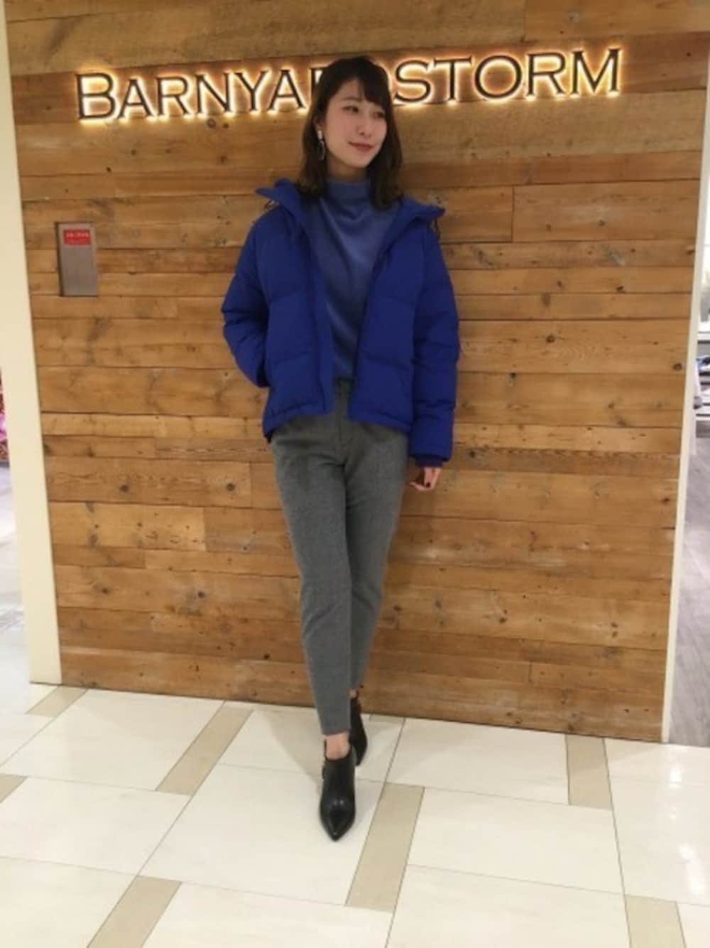 ブルーとグレーの大人カジュアルスタイルです。 アウターの中でも動きやすくストレスフリーです。 ブーティはテーパードパンツと相性の良いこだわりのカッティングです。