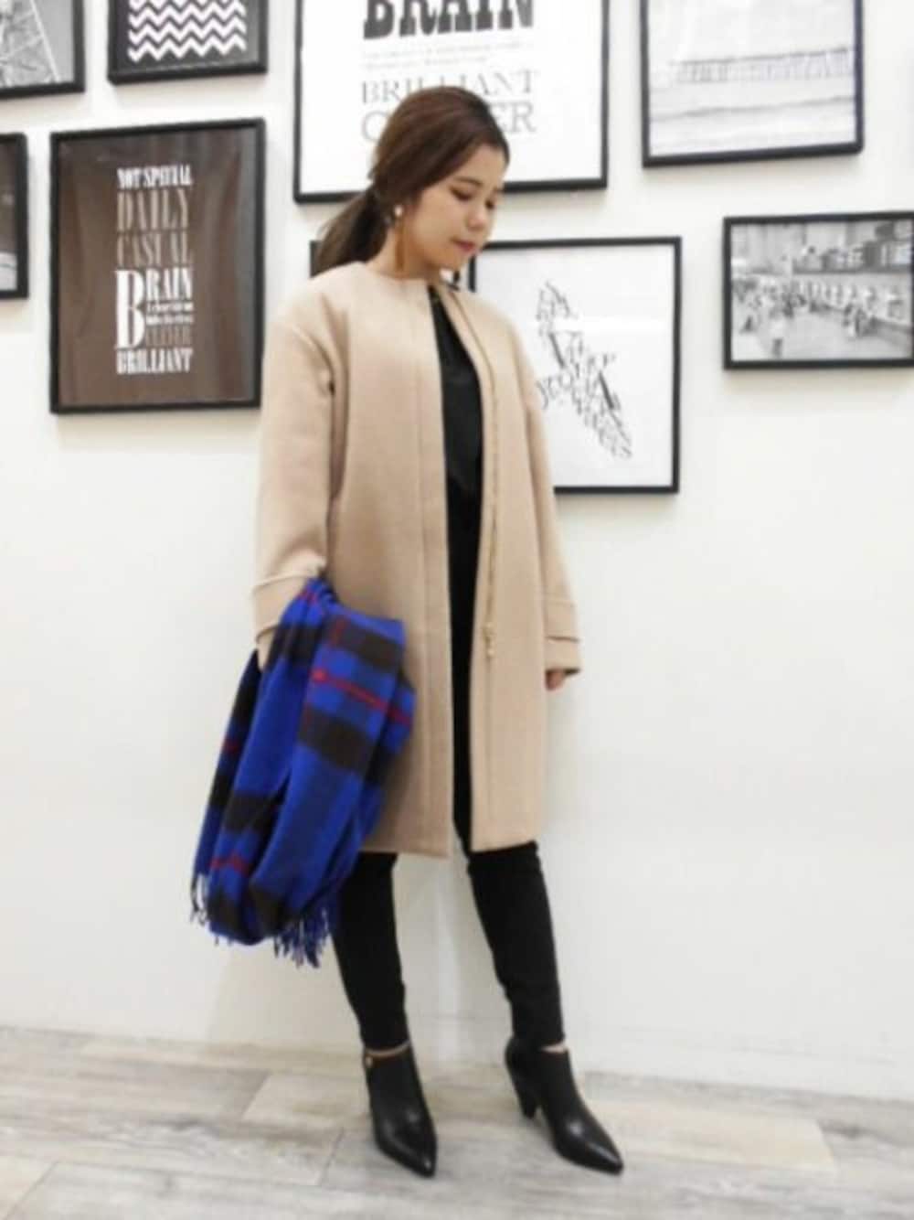 軽量のノーカラーコートはベージュだと女性らしく優しげな印象に。 チェックのストールのブルーは発色がとてもきれいです。