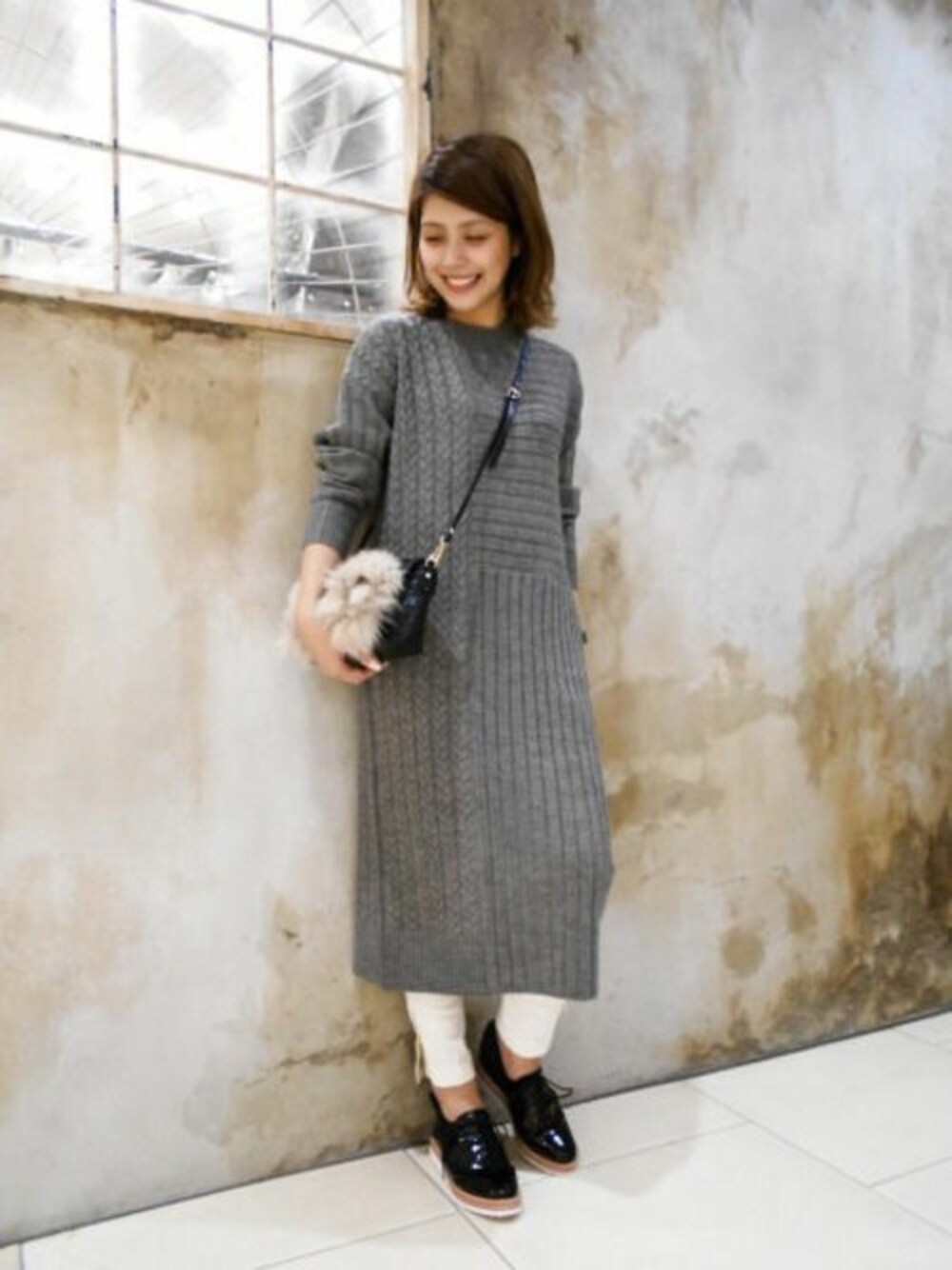 グレーのワンピースがポイントのモノトーンコーデです。 白パンツを合わせると爽やかな雰囲気に。