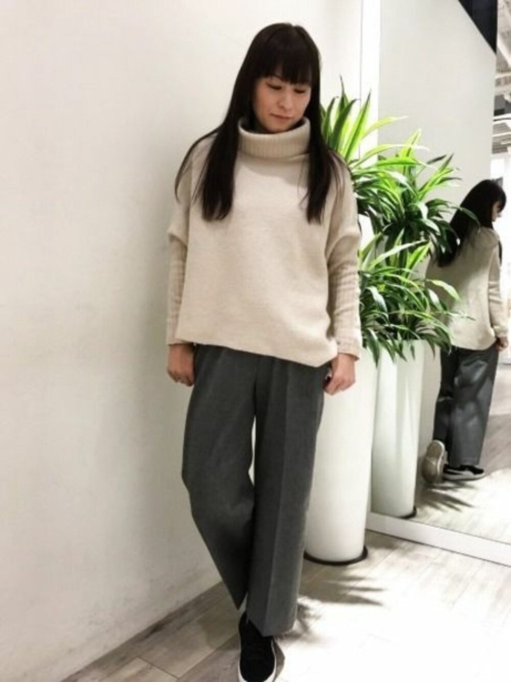 タートルのニットはトレンド感が出て、今っぽいスタイルに。 タートルの立ちも良いです。