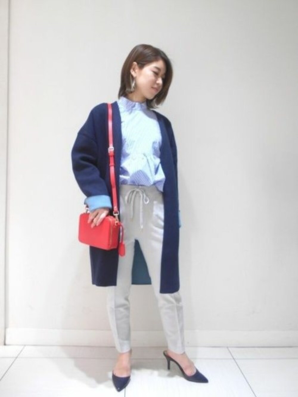 接結編みのニットコーディガンは、合わせ方次第でロングシーズン活躍できます! ベーシックカラーにレッドを効かせたコーディネートです♪