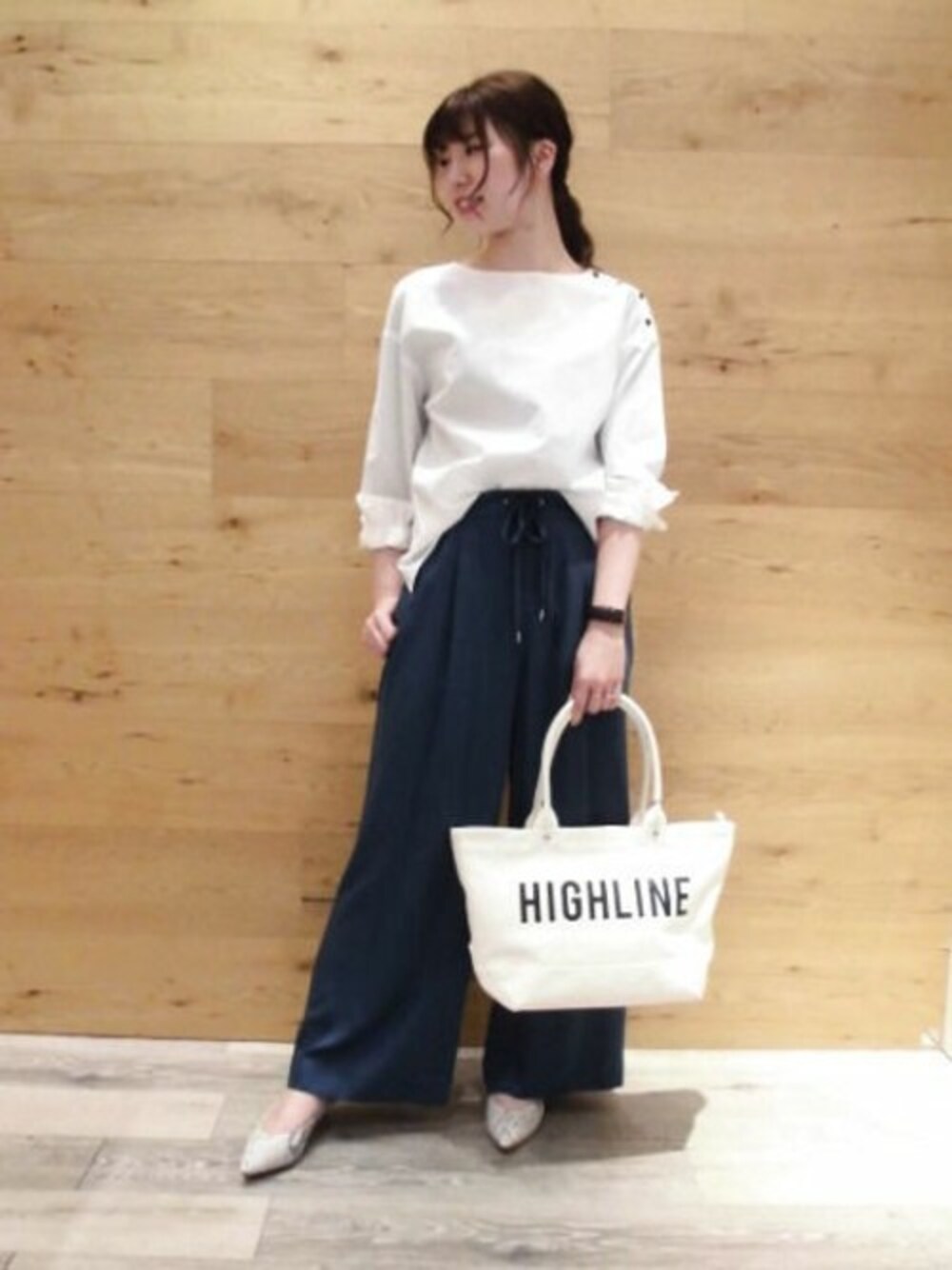 白とブルーの春コーデです。 パンツはラクチンですがカジュアル過ぎない生地感です。