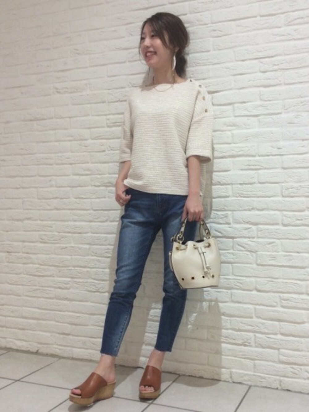 キレイめに見えるツイードのトップスも、 シルエットがゆったりなので、 カジュアルにも合わせて頂けます。