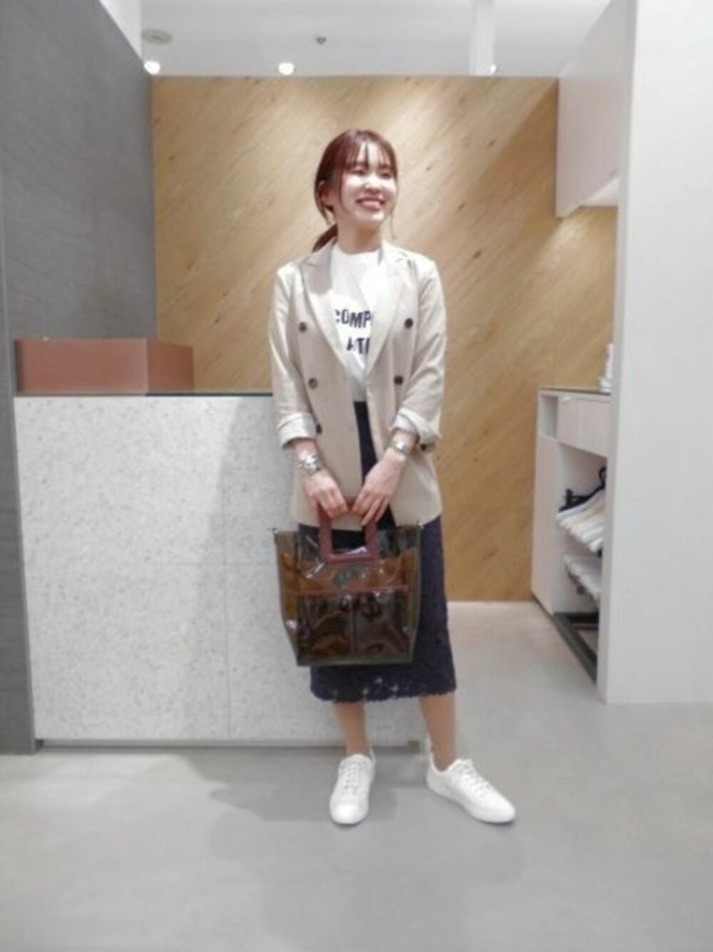 肌の見え感にジャケットを合わせ、 昨年からトレンドのクリア素材のバッグを合わせた春来意コーディネートに仕上げました♪