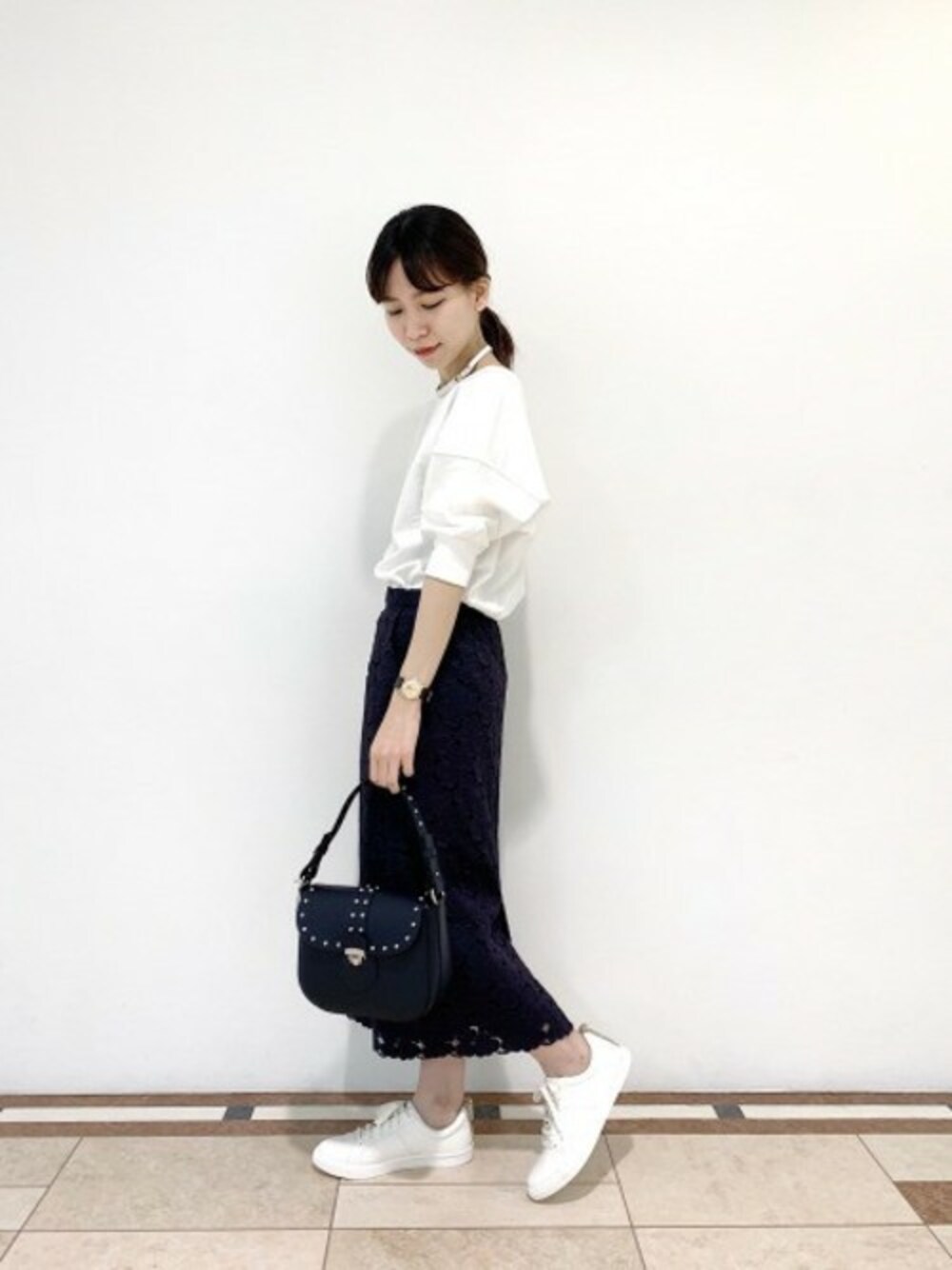 ネイビー×ホワイトのコーデです。 バッグのスタッズやレースの素材で動きが出ます。
