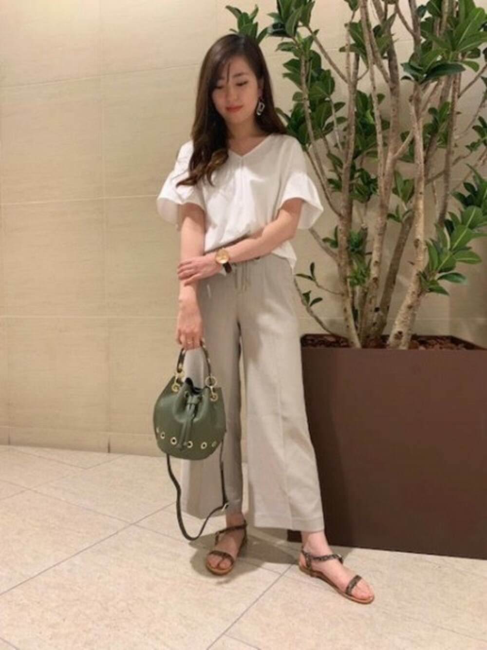 バックフリルのトップスは二の腕が細く見えて甘すぎないデザインです。