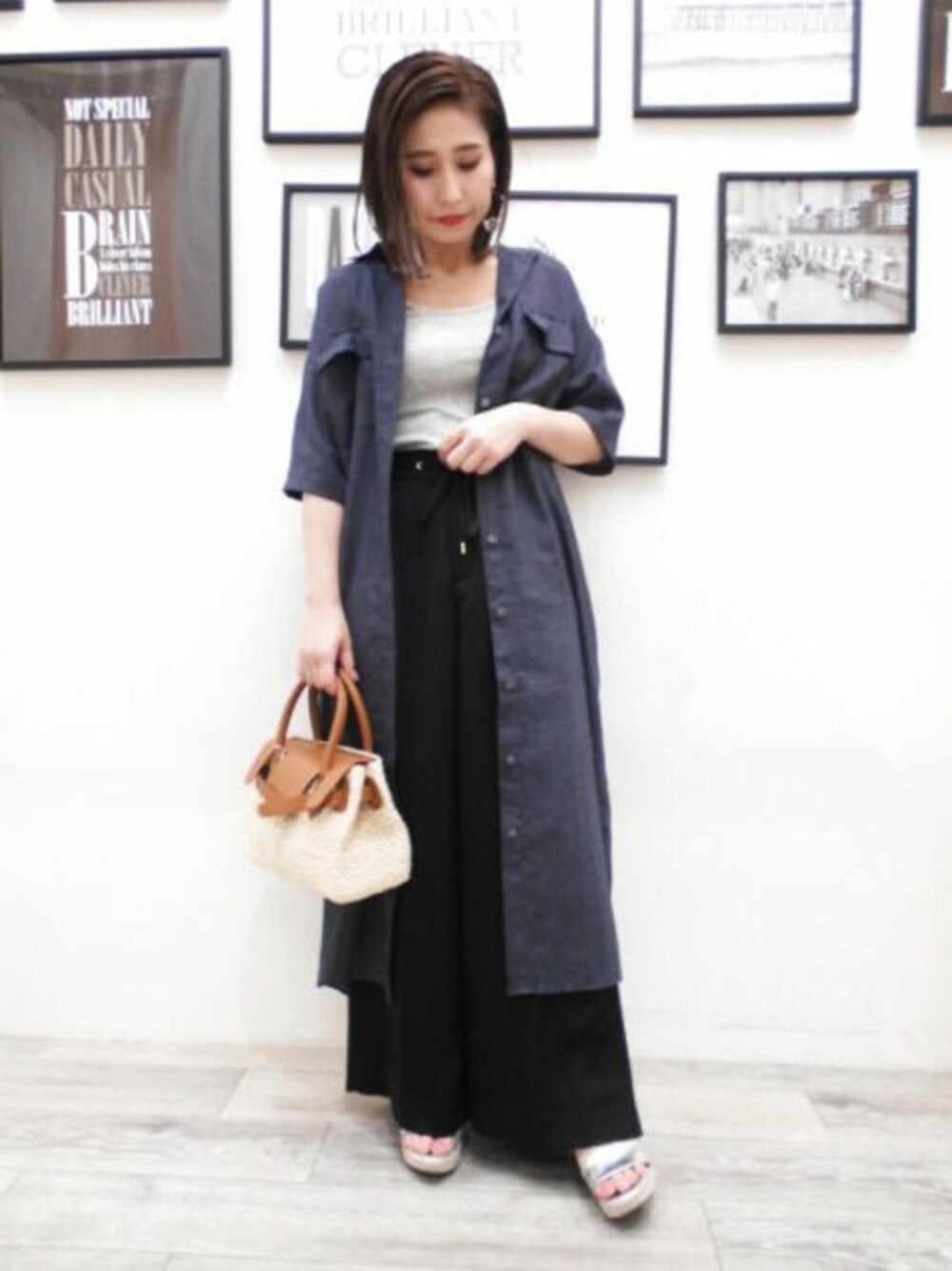 シャツワンピースとワイドパンツのコーデは Iラインでスッキリと見えます。